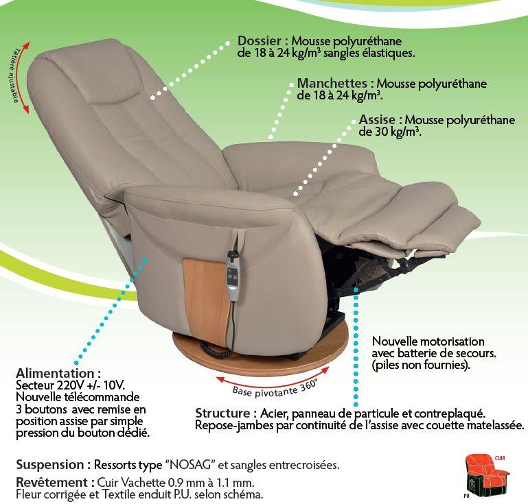 Base pivotante à 360° Têtière ajustable en inclinaison. Insert bois sur les côtés et socle bois pour un décor naturel se mariant avec tout type d’intérieur. Mécanisme de sécurité qui empêche le fauteuil de pivoter lorsque la fonction releveur est activée. Compatible avec l’option batterie rechargeable pour un fonctionnement sans fil. MAXI CONFORT Le Maxi Confort des mousses de différentes densités sont utilisées au niveau des surfaces de contact en fonction des zones de compression pour une portance optimale, une meilleure répartition des masses et un meilleur maintie... |