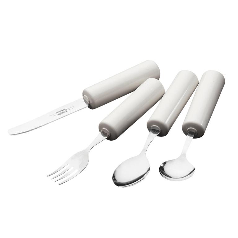 Les couverts du set (couteau, fourchette, cuillère et petite cuillère) assurent une bonne prise en main pour les personnes ayant une préhension faible ou limitée avec un manche de diamètre 3 cm et une longueur de 10 cm. Les couverts passent au lave-vaisselle. CARACTÉRISTIQUES Diamètre (manche) : 3 cm Longueur (manche) : 10 cm Matière (manche) : Plastique Matière (lame) : Acier inoxydable Coloris (manche) : Ivoire Conditionnement : Set de 4 couverts (couteau, fourchette, cuillère et petite cuillère) Garantie : 1 an |